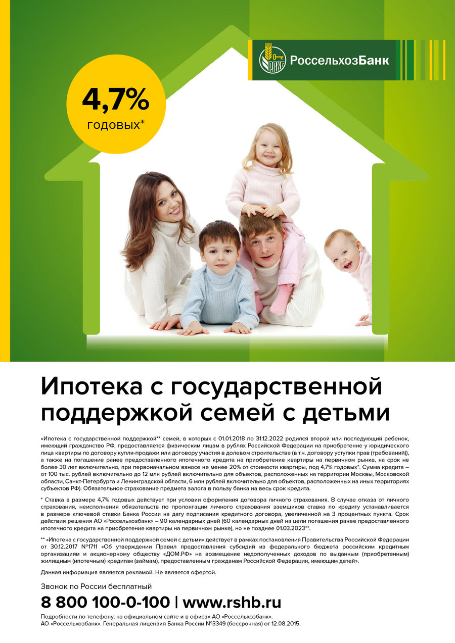 АО "Россельхозбанк": Ипотека с государственной поддержкой семей с детьми. 4,7% годовых.